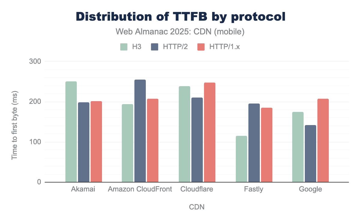 Below shows the time to first byte (TTFB) median percentile distribution for latency of HTTP/3, HTTP/2, and HTTP/1.1 across major CDNs. These measurements reflect simulated browser connections and may vary from real-world performance.