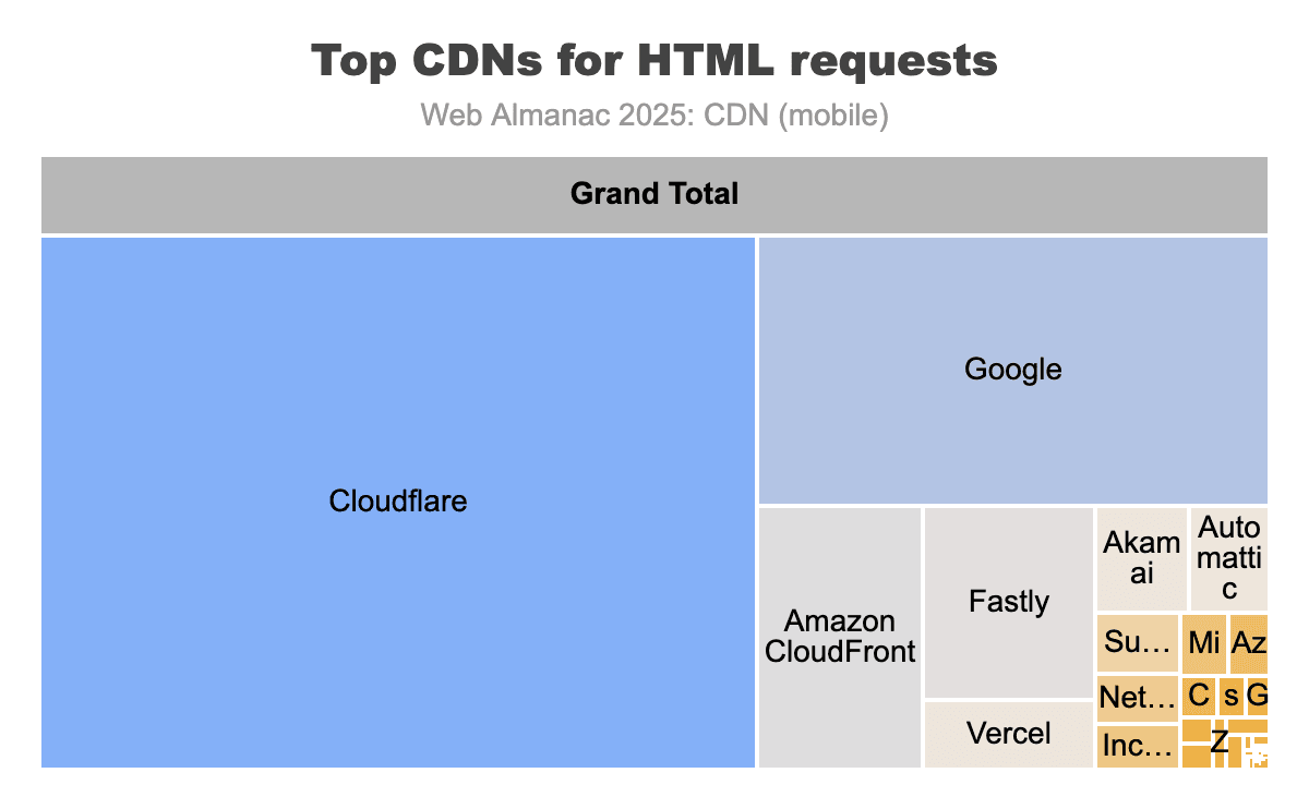 Marginally changing from 2024, the leading vendors in this category are Cloudflare (46%), Amazon CloudFront (28%), Google (5%), and Akamai (4%).