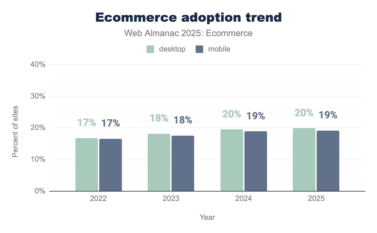 In the 2025 dataset, we detected 19.9% of all analyzed desktop sites and 19.2% of all analyzed mobile sites where ecommerce sites.