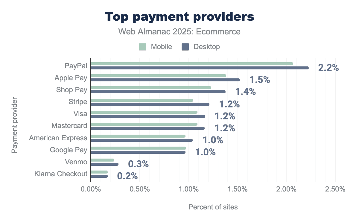 - PayPal falls from ~39% of payment detections in 2022 to ~30% in 2025 (desktop and mobile both show this pattern).