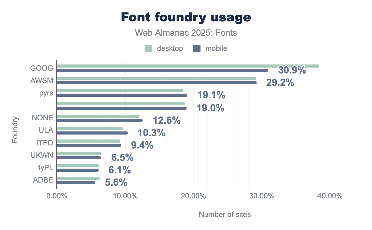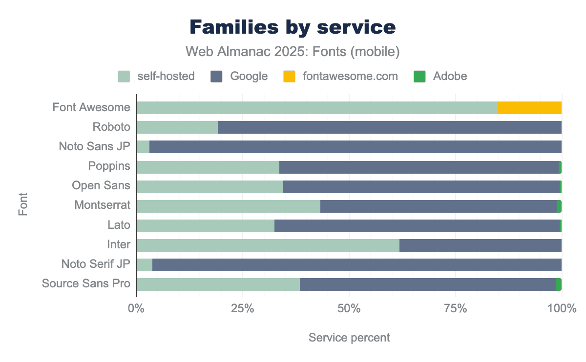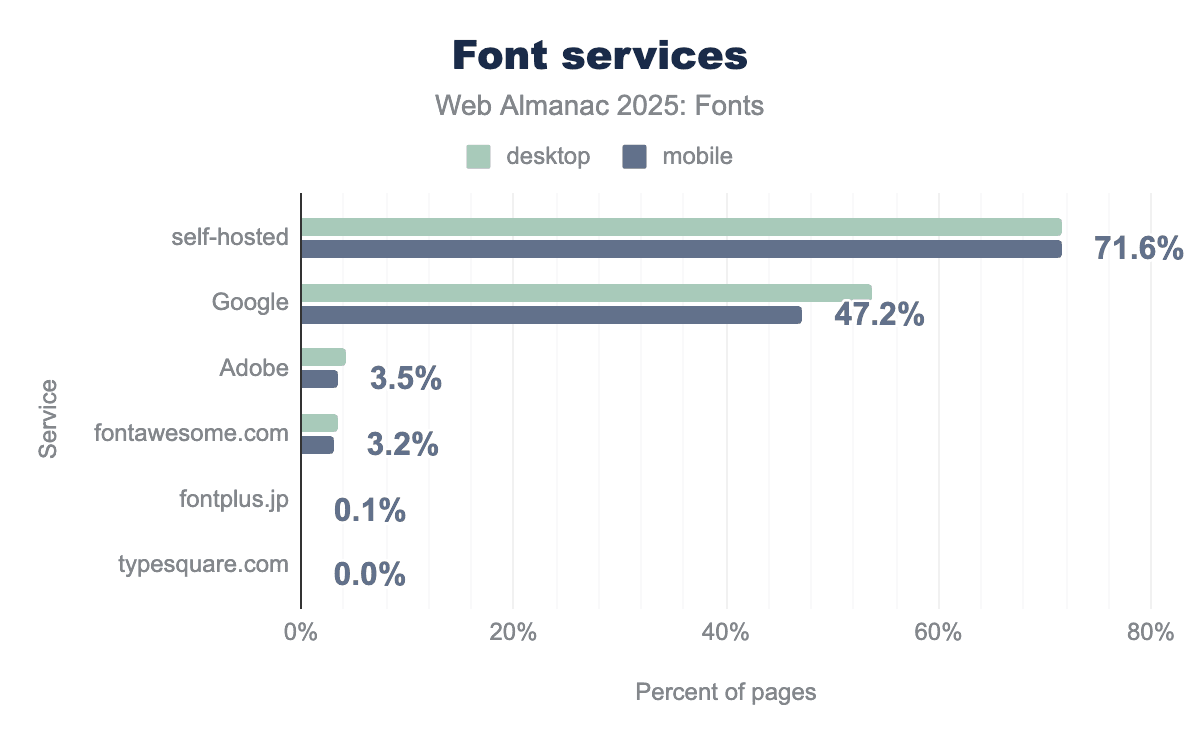 Mixed hosting (self-hosting + a service): Another 36.1% of desktop sites and 31.7% of mobile sites use a combination of self-hosted fonts and a font service on the same page. In most of these cases the service is Google Fonts, with perhaps an icon CDN or another source added in. This “hybrid” approach was slightly more common last year (around 38.5% of desktop and 32.7% of mobile pages in 2024), so it has dipped a bit as some sites fully switch over to self-hosting.