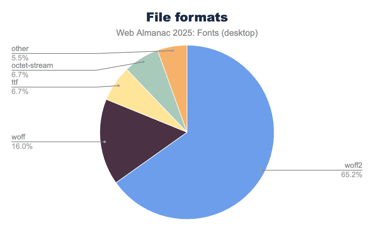 Crucially, if we combine the modern formats, WOFF2 + WOFF together account for over four-fifths of the web font ecosystem. Other formats like OpenType/CFF (.otf) or SVG fonts have effectively vanished from the public web (despite being very much alive on the desktop), and EOT (the old IE-specific format) is practically extinct. Back in 2020, the Web Almanac already noted that SVG and EOT were nearly gone, and that trend has only continued. It’s now rare to encounter a non-WOFF font file in a typical site crawl. The overwhelming advice remains: use WOFF2 for your web fonts, and drop the older formats unless you have a very specific need. This year’s crawl data strongly validates this advice as we see virtually everyone converging on WOFF2, with WOFF as a trailing fallback, while everything else is negligible.