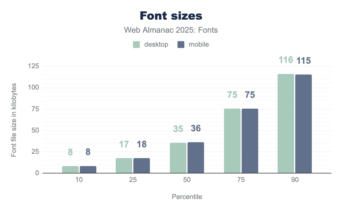 At the 75th percentile, 2024 font files were about 76-77 KB. In 2025, this is roughly similar (mid-70s KB). So three-quarters of web fonts are under 80 KB, which is still manageable especially with WOFF2 compression.