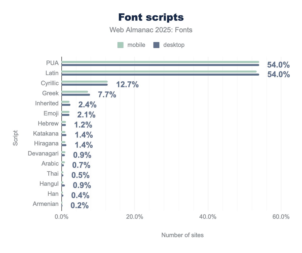 In 2025, just over half of all web fonts include Latin characters (around 54% of fonts in our dataset). Since Latin is included in most multi-script fonts, this essentially means any font intended for European or American audiences is counted there. Alongside Latin, about 54% of fonts also include the Unicode Private Use Area (PUA), which is where icon fonts and custom symbols reside. The prevalence of PUA indicates (once again) how many fonts on the web are actually icon sets or have embedded icons (Font Awesome, theme icon fonts, etc., all map to PUA).