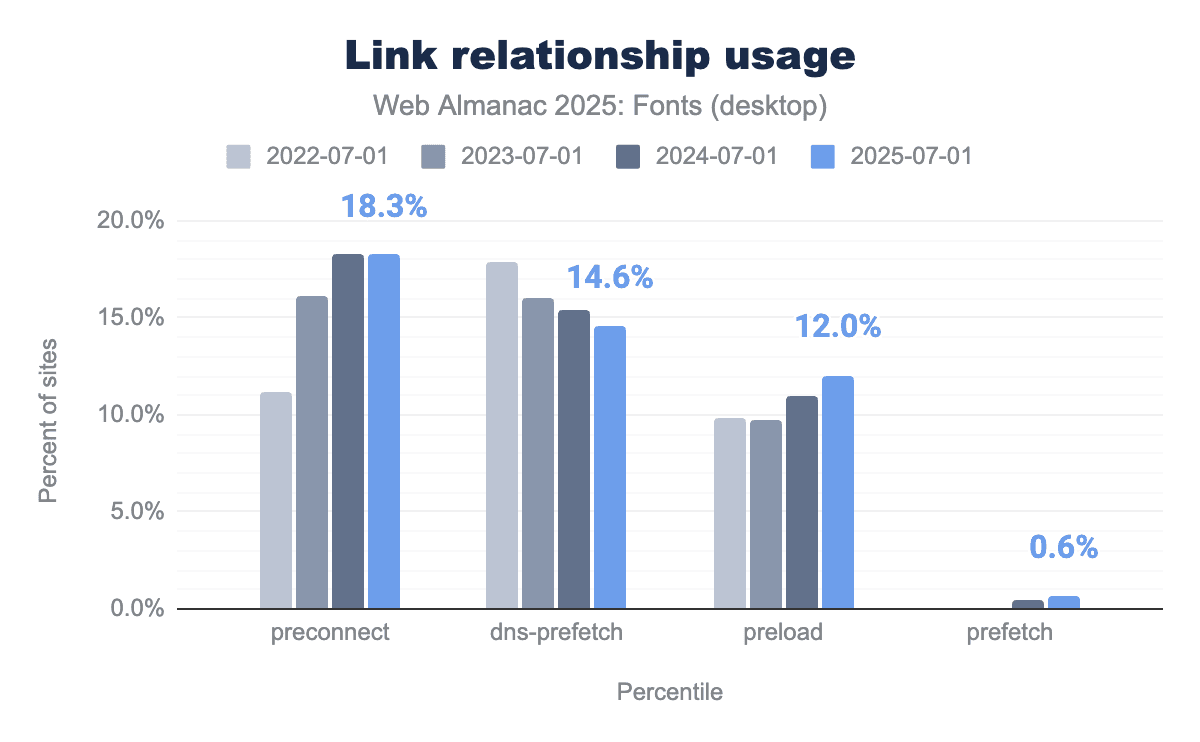 Because web fonts can cause visual abnormalities through render-blocking or delayed text rendering, many sites use resource hints to optimize how fonts are loaded. The data shows a steady adoption of these hints, with some shifting as best practices evolve.