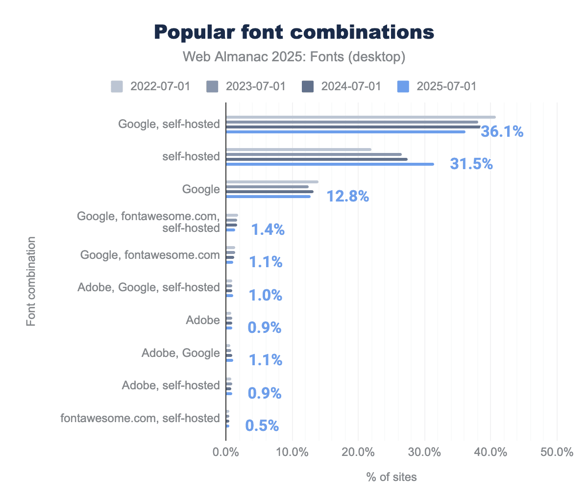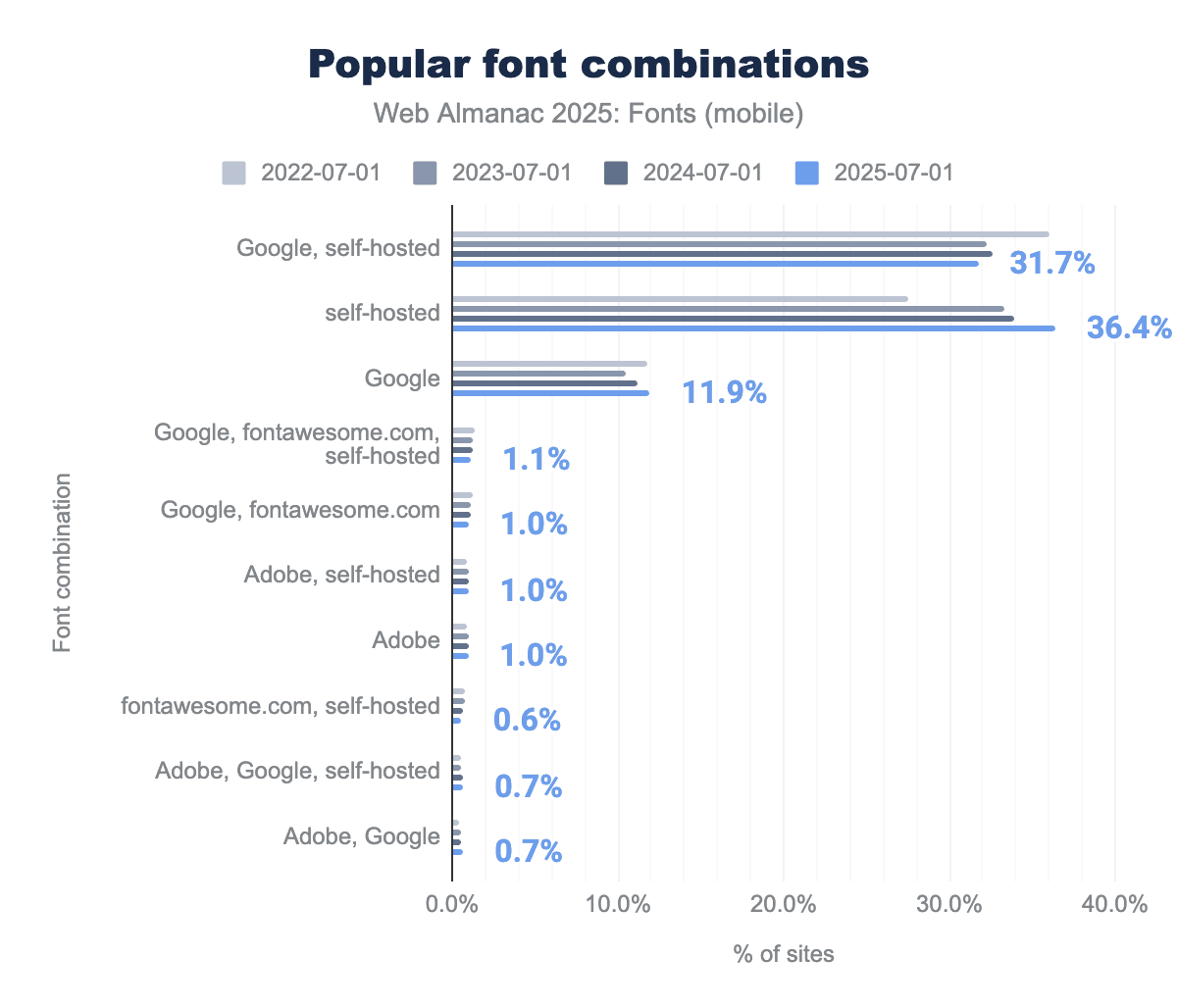 At the same time, font delivery methods on the web have been shifting. An increasing number of sites are choosing to self-host their font files (serving fonts from their own servers) rather than relying exclusively on third-party CDNs. Many other sites use a mix of both approaches. Last year’s data showed a clear rise in exclusive self-hosting alongside a decline in sites that combined self-hosting with external services, and we investigate if this trend continues in 2025.