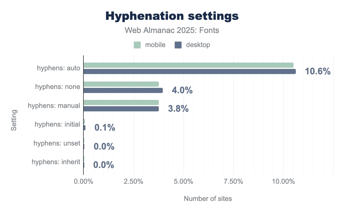 hyphens: auto property is the most popular choice, implemented on roughly 10.6% of sites. Other explicit settings like none and manual see significantly lower usage, hovering around 4% and 3.8% respectively. Across all categories, the data shows nearly identical implementation rates for both mobile and desktop users.First, let’s talk about hyphenation (CSS hyphens property). By default, browsers only hyphenate text if certain conditions are met (like lang is specified and the words are long, etc.), and some (like Chrome) might not hyphenate at all unless told. The hyphens: auto property allows automatic hyphenation when needed. In 2025, only about 10.5% of pages globally use hyphens: auto in their CSS. That’s up a bit from previous years, but still quite low. This suggests that roughly one in ten sites explicitly enables hyphenation (usually to improve justified text or narrow column text).