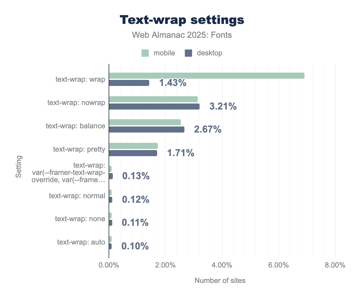 text-wrap: wrap property shows the highest usage overall, specifically surging to nearly 7% on mobile devices compared to less than 2% on desktop. Other advanced typographic controls like nowrap, balance, and pretty each account for roughly 1.7% to 3.2% of sites, showing more consistent implementation between the two platforms.Text wrapping and line breaking (CSS text-wrap property): CSS Text Module Level 4 introduced text-wrap: balance and text-wrap: pretty to help browsers distribute text more evenly. These are fairly new (only recently supported in some browsers like Safari and Chromium-based ones). Their adoption, while small, is telling of an emerging best practice for multi-line headings and such.