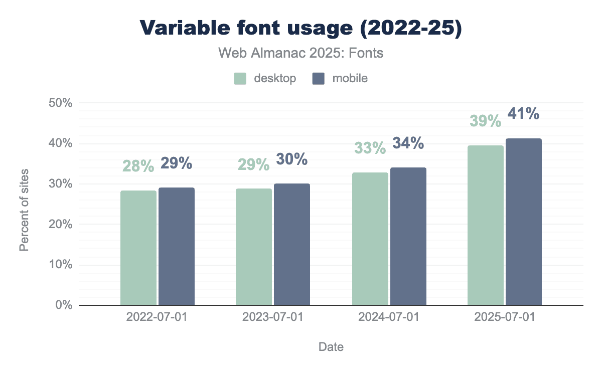 How popular are variable fonts? This year, 39.4% of desktop websites and 41.3% of mobile websites used at least one variable font on their pages. In other words, now about 4 in 10 sites are using variable fonts. This is up from roughly 33% on desktop and 34% on mobile in 2024. The growth (~6-7 percentage points in a year) is steady and significant. Notably, mobile has consistently led desktop by a small margin in variable font adoption—possibly because mobile performance benefits more from combining font files, or because many modern mobile-first sites or PWAs have embraced variable fonts for their flexibility.