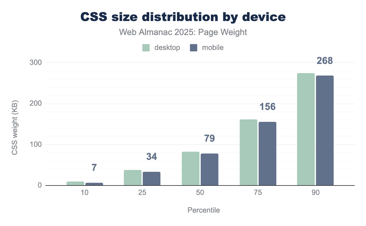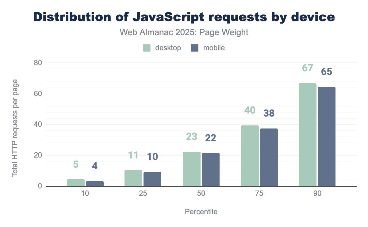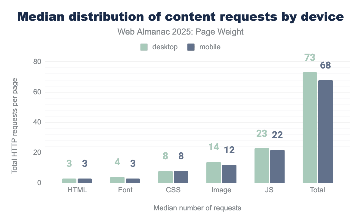 Year over year, the median home page size grew 7.8% to 2.7 MB. The median mobile home page is 2.6 MB, growing 8.4% from 2.4 MB in 2024. In 2025, the median desktop page size reached 2.9 MB, up 7.3% from 2024’s median of 2.7 MB.