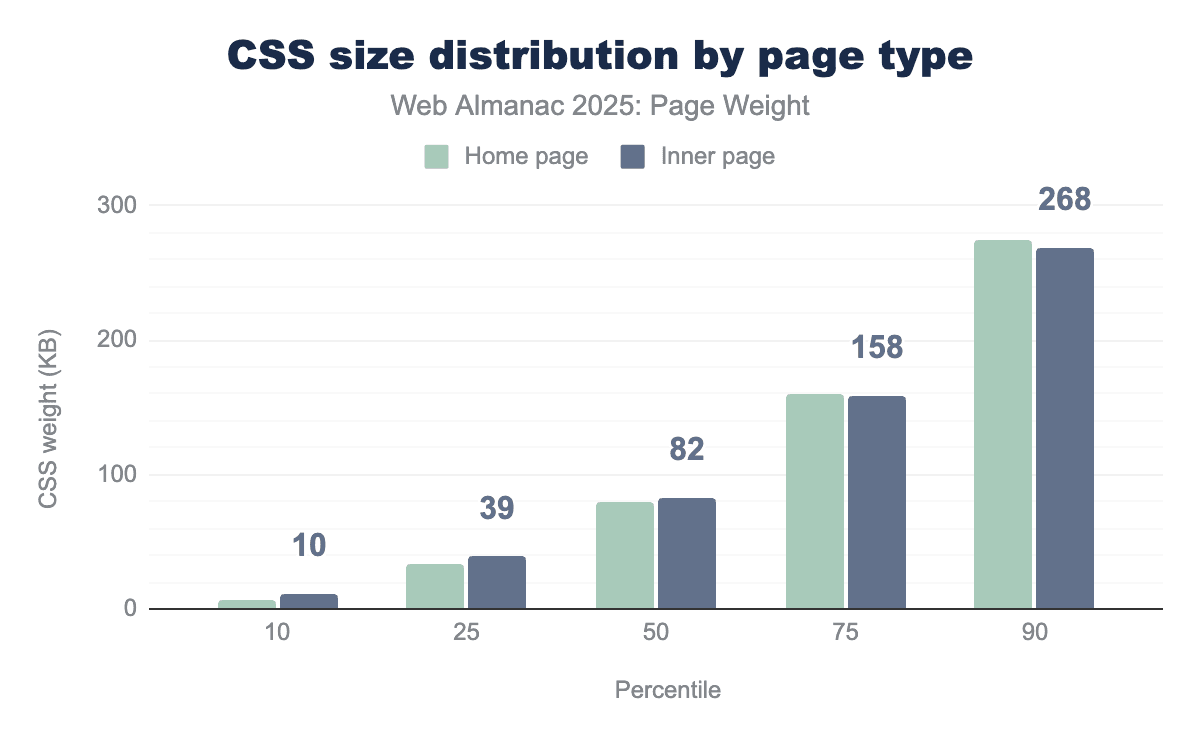 2025’s analysis shows that 61% of desktop, 62% of mobile home page loads, and 61% of desktop and mobile inner page loads passed lighthouse’s Minify CSS audit.