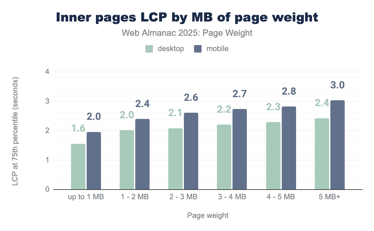 For home pages in the 2-3 MB range, LCP was achieved in 2.7 seconds on desktop and 3.2 seconds on mobile. Mobile struggled to achieve sub-2.5-second times, even for pages under 1 MB, which recorded 2.6 seconds for LCP. As page weight increases, LCP times rise accordingly, with mobile taking roughly half a second longer to render the largest content element.