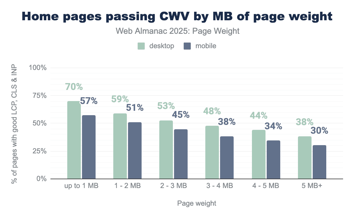 In 2025, the median home page was 2.9 MB for desktop and 2.6 MB on mobile. Within the 2-3 MB range, 63% of desktop pages passed the Core Web Vitals assessment. Because these figures rely on CrUX field data, they primarily reflect the performance of the most popular sites. For mobile in the same weight range, 53% of pages passed.