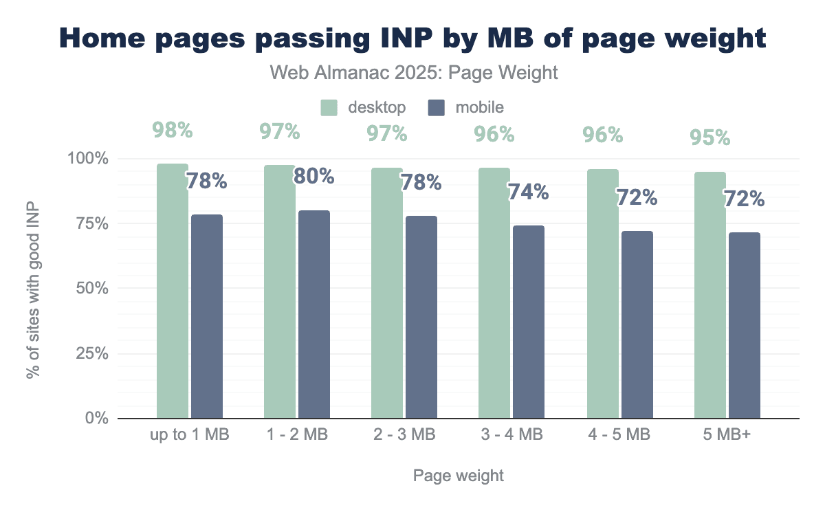 The INP metric shows the highest desktop pass rates of all the Core Web Vitals metrics. For home pages under 1 MB, 98% passed the INP, and even at 5in the 5+ MB range, 95% of desktop home pages still passed the assessment.