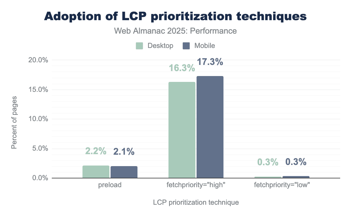 Adoption of fetchpriority="high" has continued its growth, now appearing on 17% of mobile pages with LCP images—up from 15% in 2024. Preload usage remains low at 2.1-2.2%.