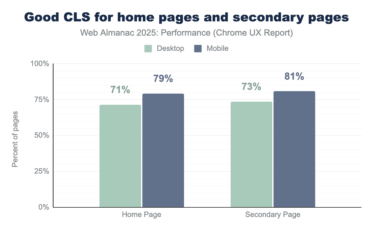 Pages beyond the homepage show slightly better visual stability than homepages across both desktop and mobile devices when looking at page-level CrUX data. In 2025, 73% of desktop secondary pages achieve “good” CLS compared to 71% of desktop homepages, while on mobile 81% of secondary pages meet the “good” CLS threshold versus 79% of mobile homepages. This suggests that homepages, which often contain more dynamic content such as hero media, banners, and promotional elements, remain more prone to layout shifts than secondary pages.
