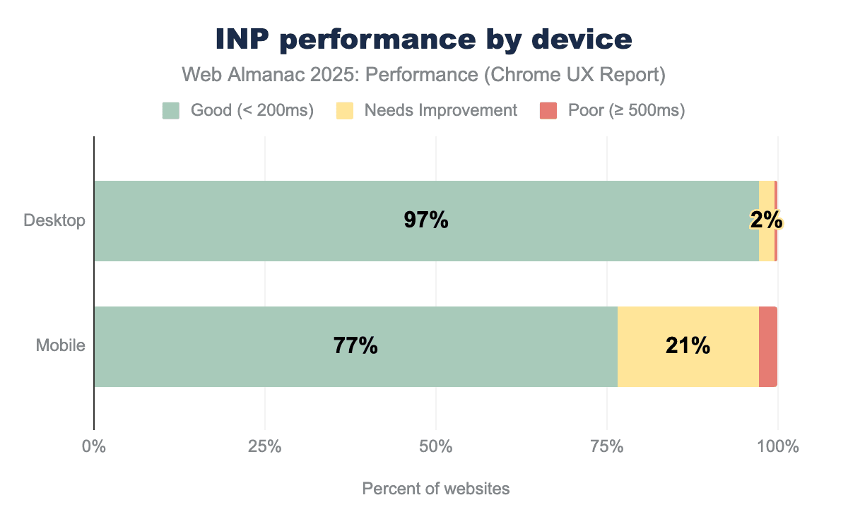 In 2025, mobile INP performance showed encouraging improvement, with 77% of websites achieving good scores—up from 74% in 2024. This 3 percentage point gain represents meaningful progress, as millions of websites now deliver more responsive experiences to mobile users. Desktop performance remained exemplary at 97%, maintaining the high standard established in previous years.