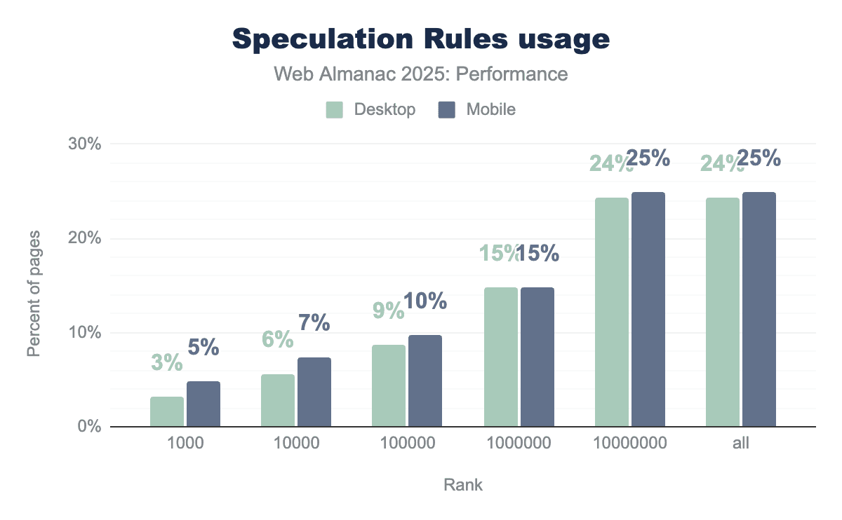 In the chart below, which shows the percentage of home pages that contain Speculation Rules, we see something interesting: Speculation Rules usage on the top 1,000 sites is quite low, only 3% on desktop and 5% on mobile. And while usage climbs for each subsequent group, it only reaches 15%, mobile and desktop, for the top 1,000,000 sites. It is not until the final group, the top 10,000,000, that we see the percentage jump sharply up, to 24% desktop and 25% mobile: