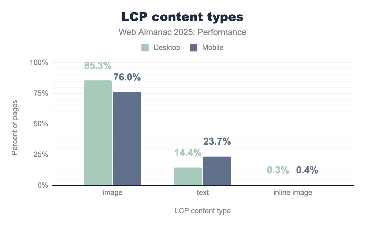 The trend in LCP content types is similar to previous years (see also 2022 and 2024 data). Images continue to dominate LCP elements across both device types, with 85.3% of desktop pages and 76% of mobile pages having an image as their LCP element. Text-based LCP elements account for much of the remainder—14.4% on desktop versus 23.7% on mobile. This gap likely reflects responsive design practices where hero images are resized, replaced with smaller visuals, or removed entirely on narrower viewports, allowing headline text to become the largest visible element instead.
