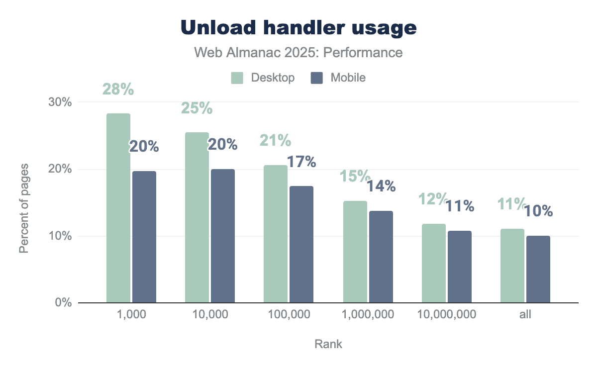The Chrome team recommends avoiding unload in favor of alternatives such as visibilitychange or pagehide, a shift that is reflected in recent usage patterns. Compared to 2024, unload handler usage declined across all ranks and both devices in 2025. This reduction suggests that more pages are now eligible for bfcache behavior. Despite this progress, unload handlers remain more common on higher-ranked sites and on desktop, continuing to limit bfcache eligibility for a significant portion of the web, as seen below in the graph.