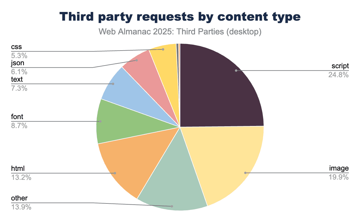 script (24.8%), image (19.9%), and other (13.9%)The chart shows that third-party requests are dominated by script, image, and the other category. Together, script, image, and other account for more than half of all third-party request content types. This pattern is consistent with the 2024 edition, which also identified script, image, and other as the top request types, indicating little change since last year.