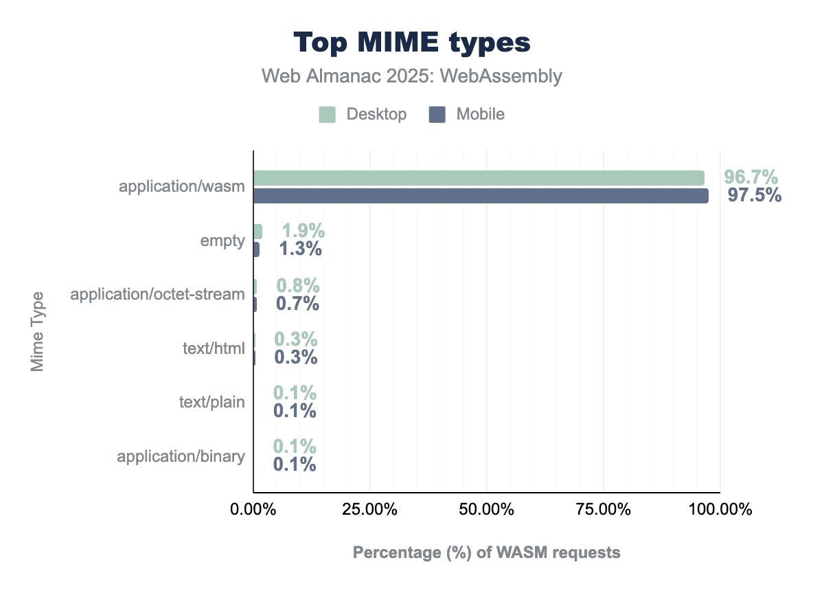 We observed that the MIME type application/wasm is used in 293,470 requests on desktop clients and 301,127 requests on mobile clients.