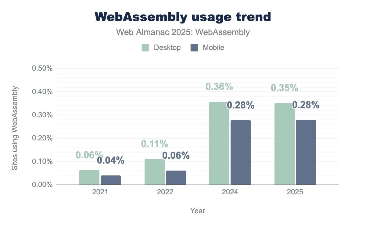 Interestingly, looking over previous Web Almanac years, WebAssembly requests have increased drastically from ~0.05% in 2021 to 0.28%/0.35% this year. There was also a slight dip from 2024.