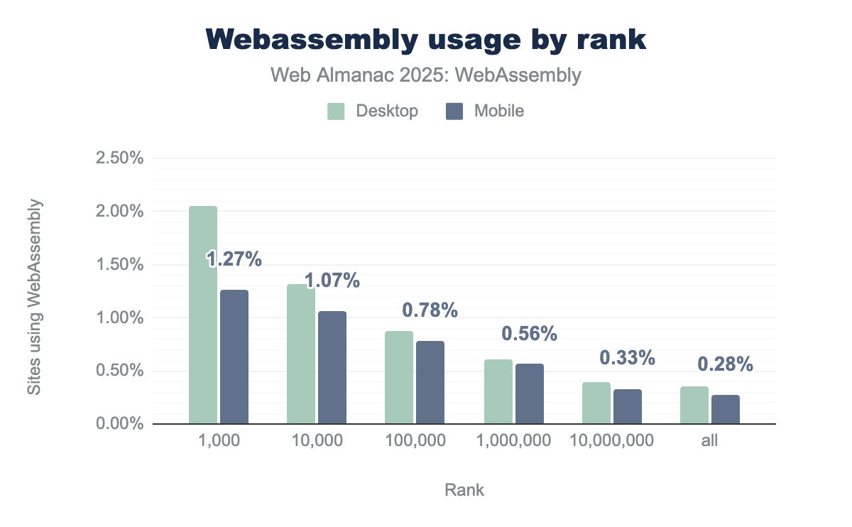 Platform Parity: There is a very close correlation between desktop and mobile usage across all ranking groups. This confirms that Wasm is being used as a cross-platform solution rather than being restricted to desktop-only environments.